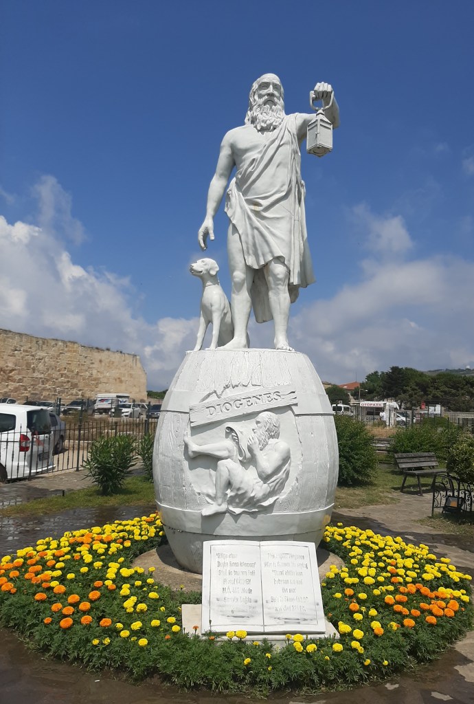 İsmini Yunan Mitolojisindeki Irmak Tanrısın kızı Tanrıça Sinope’den alan Sinop’un tarihi dört bin yıl öncesine dayanıyor. Haliyle Anadolu’daki tüm şehirler gibi pek çok uygarlığa ev sahipliği yapmış. Şimdi ise yaklaşık elli binlik nüfusuyla sakin bir Ege kasabasını andırıyor. Önceki akşam İstanbul’dan gelmiş diğer düğün ekibi arkadaşlarım Halim ile Cem’in bizi beklediği kafe, cezaevini geçince karşımıza çıkan Sinop Kalesinin arkasındaki kordonda. Kordonun bu kısmında ve şehir merkezindeki bazı başka alanlarda alt yapı çalışmalarına girildiğinden, şehrin şantiye haline denk gelmişiz. Yine de kendine has, ülkenin ve dünyanın geri kalanında olduğu gibi kapitalizme ve globalleşmeye pek meraklı olmayan bir havası var Sinop’un. Hiç AVM’si yok, her şehirde pıtrak gibi biten kahveci ve fast food’çu zincirlerinden hiç biri henüz açılmamış. Kaldığımız yerde havlu yok diye aradığımız o meşhur zincir giysi dükkanlarından sadece iki tanesini zar zor bulunca fark ediyoruz bu havayı. Herhalde bu yüzden yıllardır TÜİK verilerine göre ‘en mutlu şehir’ seçiliyor. M.Ö 400’lü yıllarda yaşamış Yunan Filozofu Diyojen’in memleketi ne de olsa ‘Sinope’! Hocası Antisthenes’in doğaya uygun, mala mülke aldırmadan yaşama çağrısına uymuş, bir fıçı içinde ömrünü geçirmiş Diyojen. Rivayete göre felsefeye meraklı Büyük İskender bir gün ziyaretine gelmiş ve bir isteği olup olmadığını sormuş da Diyojen “Gölge etme, başka ihsan istemem.” yanıtını vermiş.
