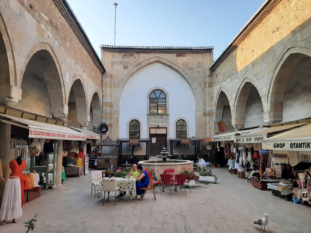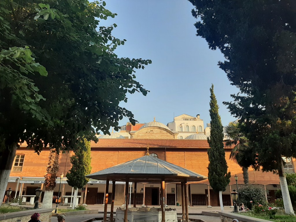 Hamsilos dönüşü Halim’i havalimanında bıraktıktan sonra, Sinop’taki son gecemizi de yürüyerek indiğimiz merkezde geçiriyoruz. Yemekten önce, trafiğe kapalı olup olmadığını anlayamadığımız Sakarya Caddesinden geçiyoruz bir kez daha. 1215 yılında Selçuklu Sultanı Alaeddin Keykubat’ın Sinop’u fethiyle yaptırdığı ve Anadolu’daki Erken Dönem İslam Mimarisinin en önemli örneklerinden kabul edilen bu camiyi, avlusundaki uzun ve yeşil ağaçlarıyla hatırlayacağım. Hemen arkasında da Pervane Medresesi var. Burası da 1262’de Sinop’un Pontus Rumlardan alınmasından sonra yaptırılmış, dikdörtgen şeklinde, serin bir avlu. Şimdi içinde çeşitli el işi hediyelikleri satan dükkanlar var.