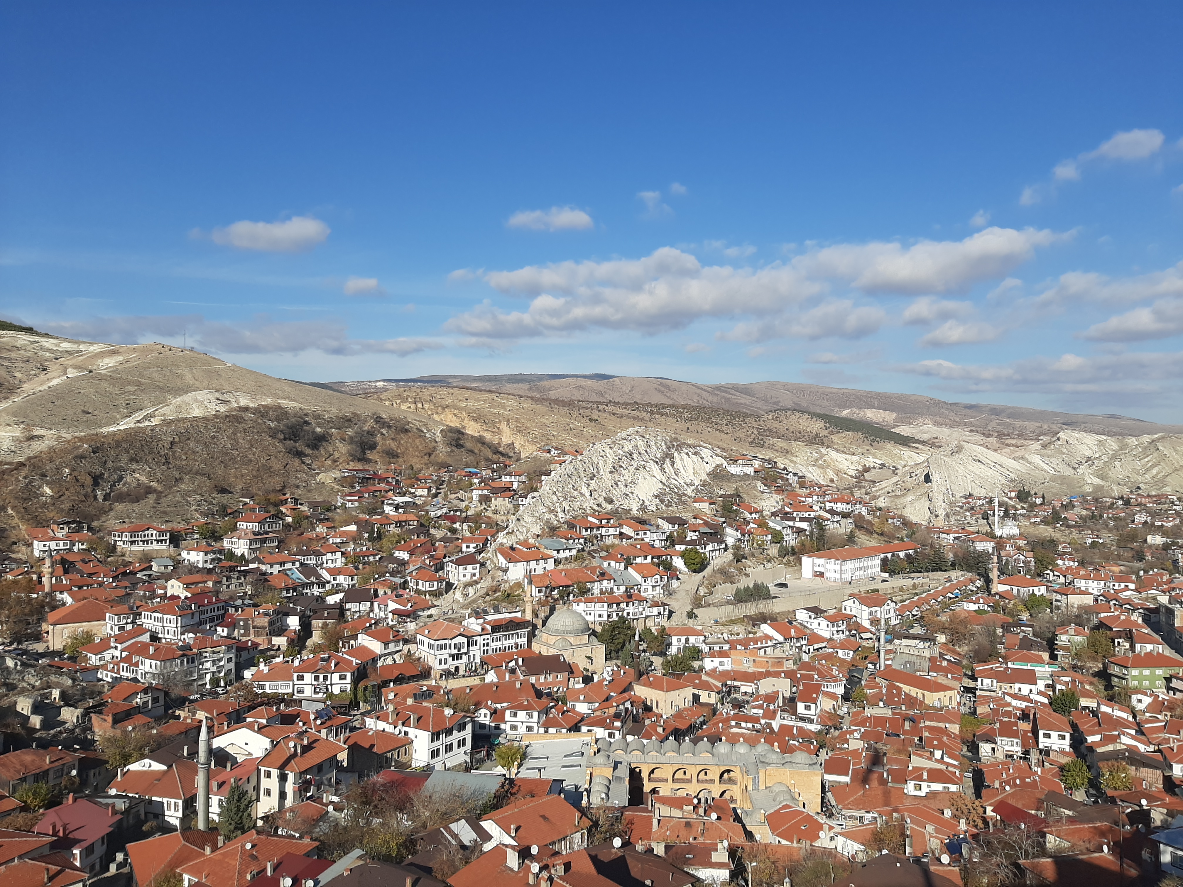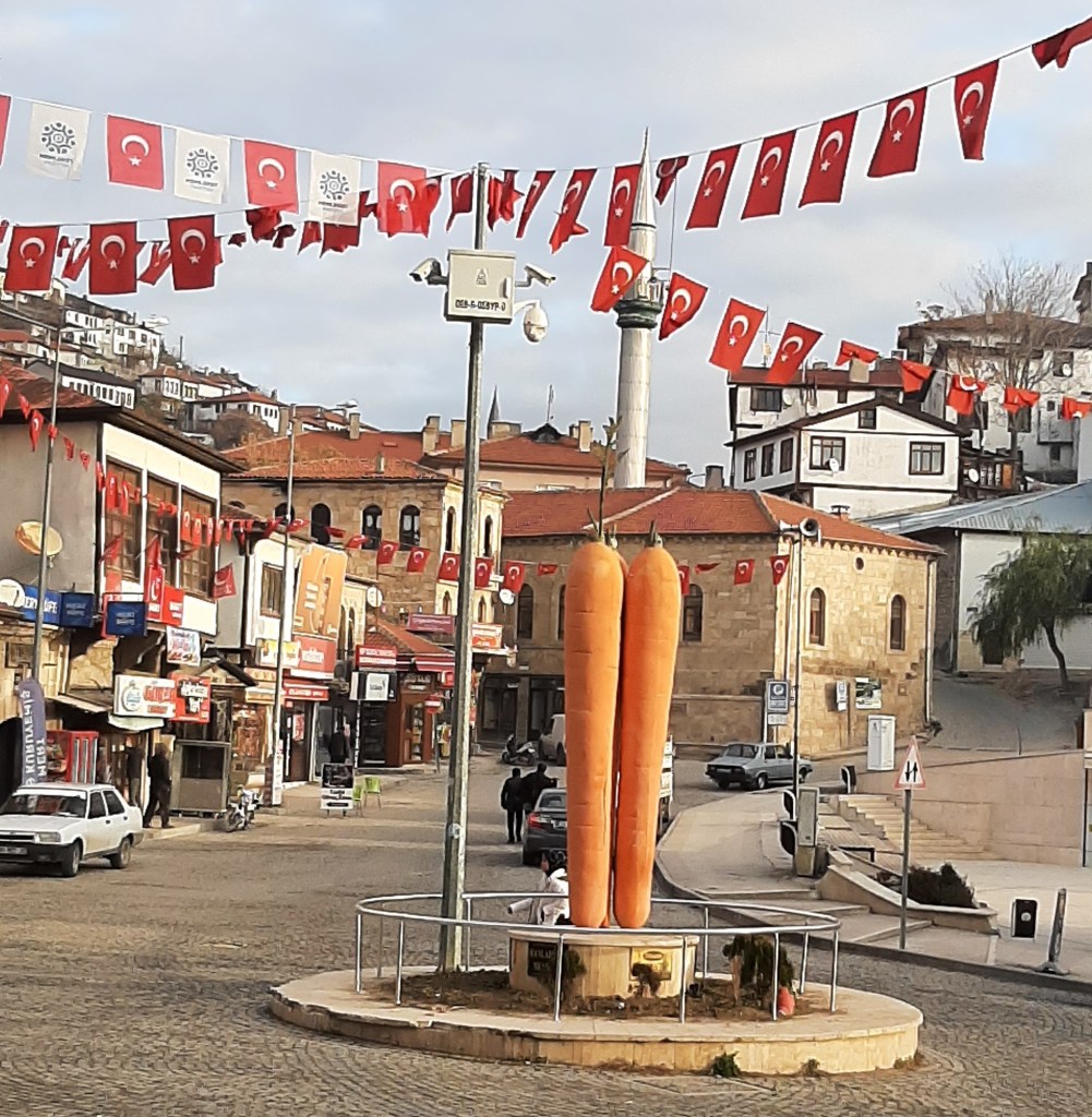 Beypazarı, tarihi olarak Nallıhan’la aynı medeniyetlere ev sahipliği yapmış. Osmanlı Devletine katıldığı Orhan Bey zamanından beri tımarlı sipahi beylerinin yetiştiği bir yer olduğundan; o zamana kadar Luvice ‘kaya doruğu ülkesi’ anlamına gelen ”Lagania” ismi, ”Beğ Pazarı”na dönüşmüş. Bugün 50 bin nüfuslu ilçe olan Beypazarı’na hafta sonları ciddi bir yerli turist akını var. Önce Hıdırlık Tepesine çıkıp ilçeye tepeden bakıyoruz. Buradaki manzara; iki büyük kayanın ortasına inci gibi dizilmiş beyaz badanalı Beypazarı Evleri. Evvlerin arasındaki renkli yapılar; Osmanlı Dönemi eseri olan Sulu Han ile Beypazarı meydanındaki dev havuç heykeli! Beypazarı’nın havucu meşhur çünkü. Diyarbakır’a karpuz, Malatya’ya kayısı heykeli dikiliyorsa Beypazarı’nda neden havuç olmasın? 🙂