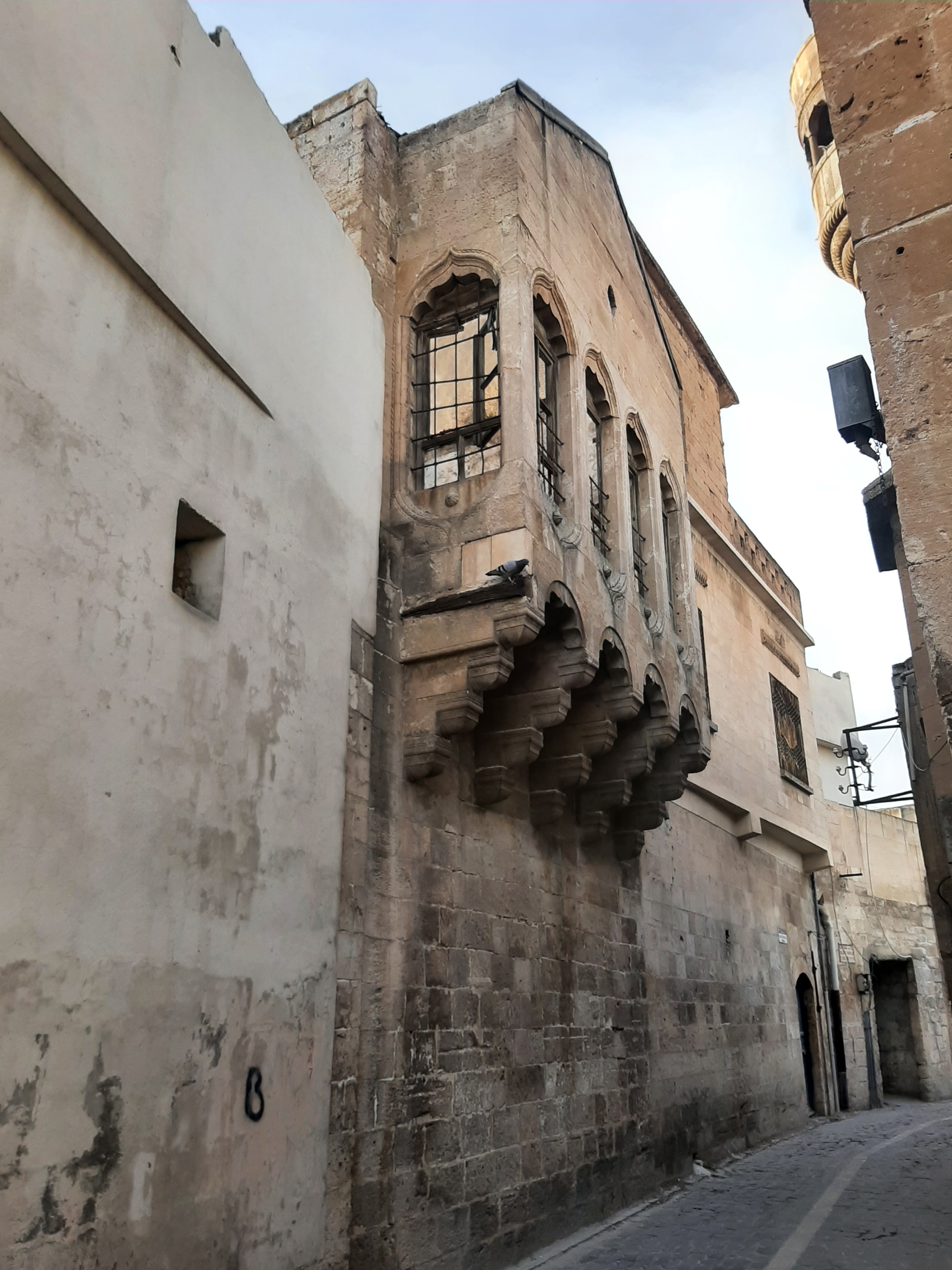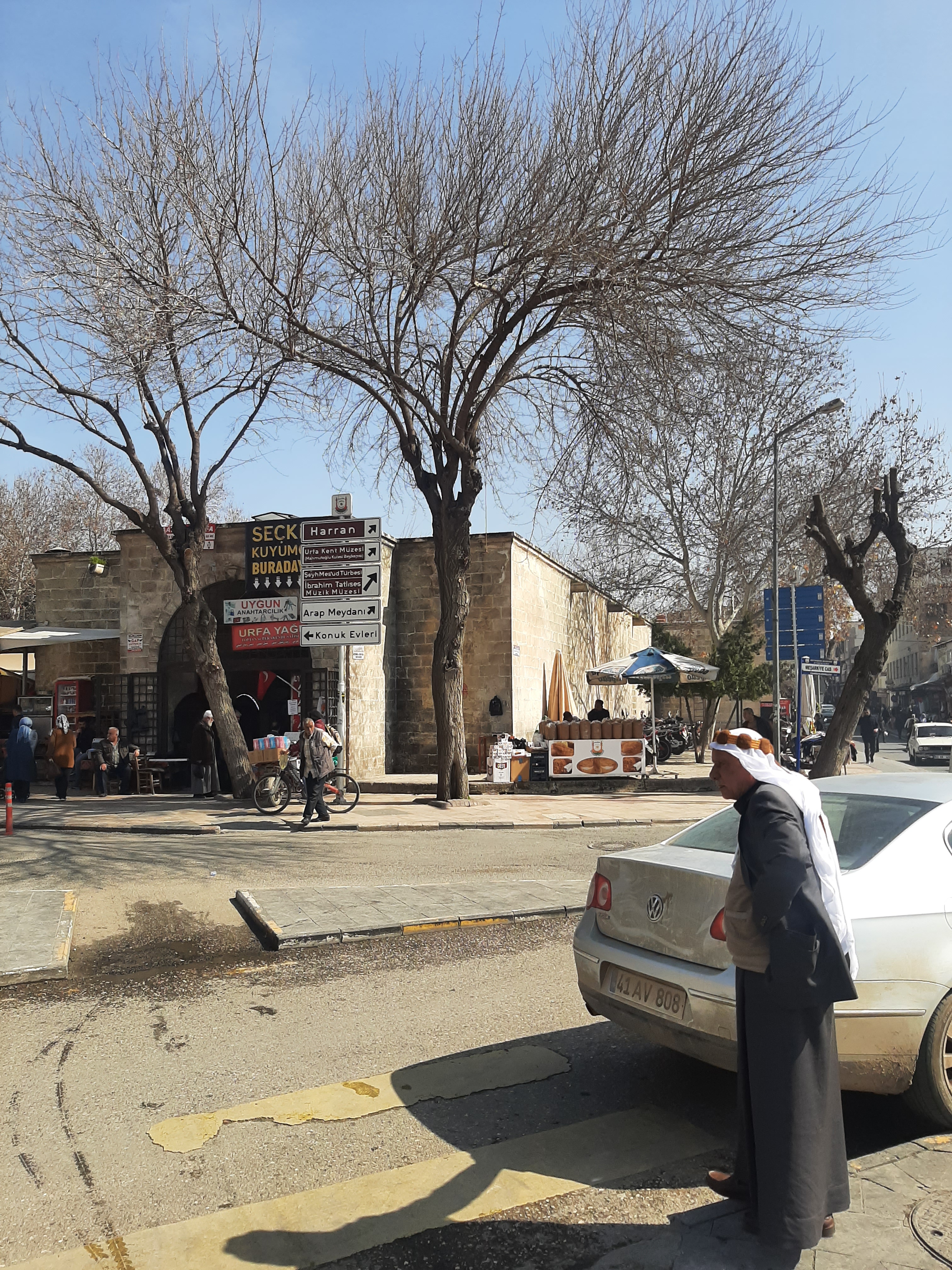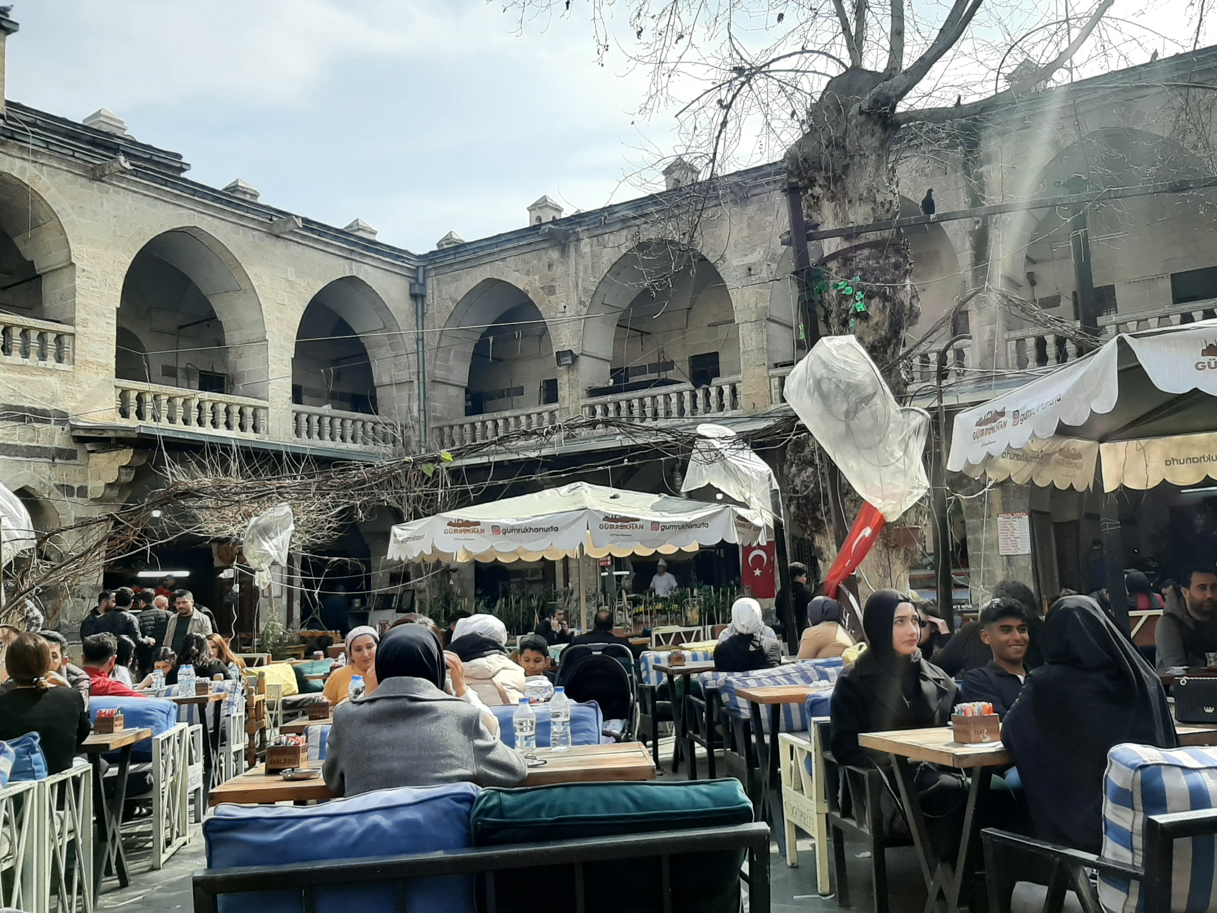 Gümrük Han 1500’lerde, Osmanlı zamanında yapılmış bir kervansaray. İçinde kebapçılar, kahvehaneler var. Çok acıktığımızdan birer buçuk porsiyon ciğeri anında tertemiz ettik ve galiba lezzet turumuzu bu ciğer ile en yüksek noktadan başlatmış olduk. Sonra kahve içmek için yine handa bir kafeye oturduk. Urfa’nın şehir merkezini on yıl önce birkaç saatliğine görmüştüm. İstanbul’dan Antep niyetiyle çıktığımız bir hafta sonu, arkadaşlarım iki evli çift ile Halfeti, Birecik ve Göbeklitepe’ye kadar gelmişken merkeze de uğrayıp koşa koşa Balıklıgöl’ü, Hz. İbrahim’in doğduğu mağarayı ve Hz. Eyüp’ün sabır makamını görmüş, dürüm yemiş ve kötü bir sıra gecesi deneyimi ile ayrılmıştım.* Şimdi daha geniş ve mutlu bir zamanımda, yeniden tanıştım şehirle. Beyaz kesme kalker taşlı, yaşlansa bile hala çok güzel, çıkmalı (cumbalı) yapıları var; Diyarbakır, Mardin gibi dar sokaklarla birbirine bağlanmış.