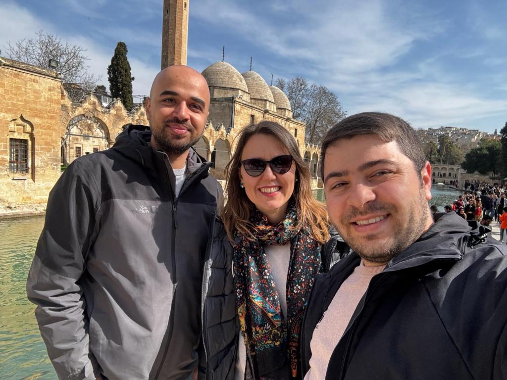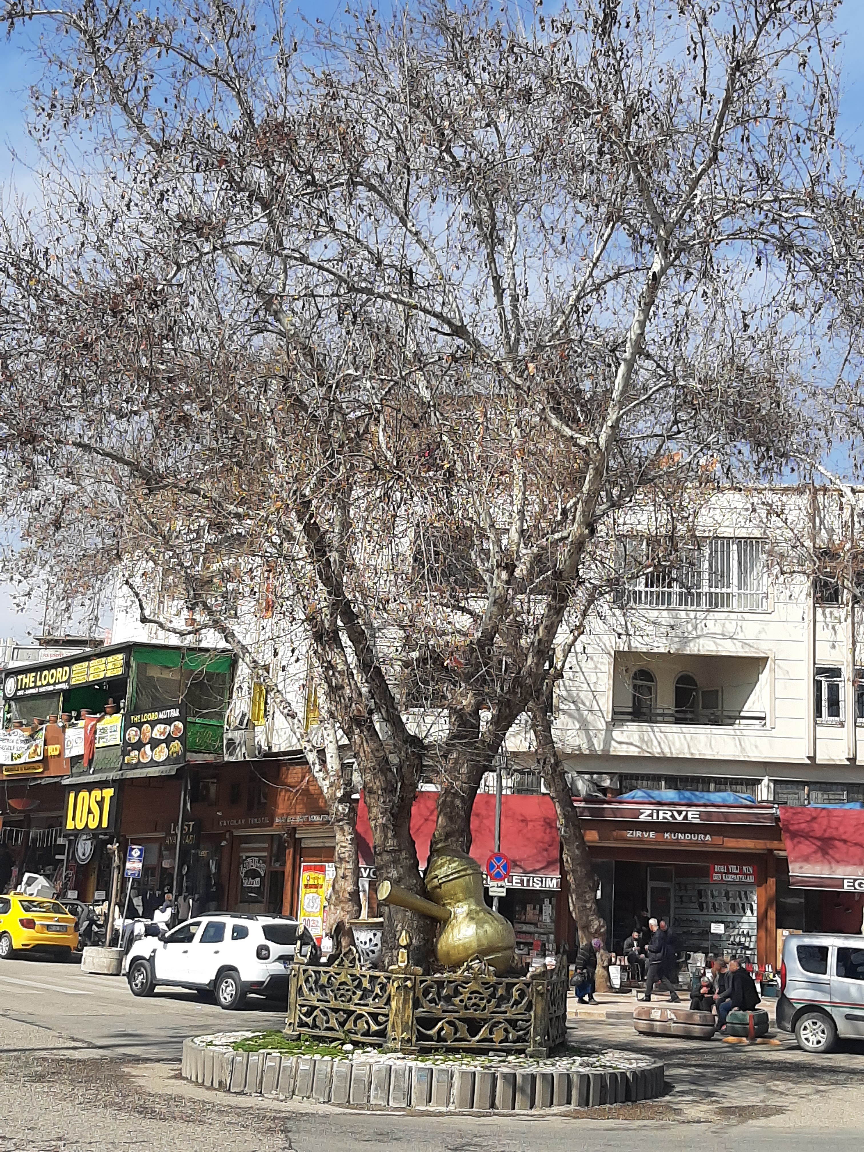 1 Mart Cuma sabahına karşı Utku ile Urfa Otogarı’na vardık, eski bir konaktan restore edilmiş otelimizi bulduk, uyuduk, dinlendik. Sabah havaalanından gelecek Ali ile buluşmak üzere Haşimiye Meydanına doğru şehrin kalabalığına daldık. Vakit cuma namazı ve muhit eski dükkanlarla dolu tarihi çarşı olduğundan etrafta puşili, şalvarlı, esmer adamlar ve uzun etekli, renkli yöresel kıyafetli kadınlar dolaşıyordu. İnsan kalabalığı, trafik sıkışıklığı, alt yapı çalışmaları, yıllar önce yapılmış estetik binaların bakımsızlığı ve arada Akdeniz’i hatırlatmaya çalışan tek tük palmiyeler… Ali gelince kahvaltı etmek, yani ciğer yemek üzere Gümrük Han’ı aramaya başladık. Yol arkadaşlarımın etrafımızdaki curcunaya dair ilk tespitleri ”Mogadişu” oldu. Somali’nin başkenti. Gezinin devamında beni çok güldüren başka yorumları da olacaktı. Ali’nin düz, dolaysız ifadeleri, Utku’nun dürüst, şeffaf değerlendirmeleri; ikisinin Yozgat-Elbistan ekseninde karşılaştırdıkları Anadolu’ya has söylemleri, Umut Sarıkaya karikatürleri ve Vizontele replikleriyle dolu cümleleri… Bu iki genç adam, sanırım son altı aydır bana en çok kahkaha attıran insanlar! 🙂