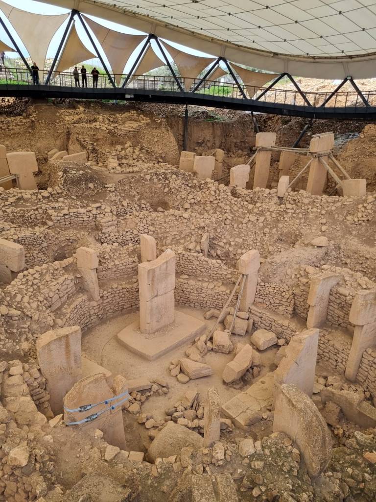 Önce Göbeklitepe’ye uğradık. Yıllar önce bir akşamüstü güneş batmak üzereyken gördüğüm, kazıları henüz bitmemiş Göbeklitepe, Doğuş Holding tarafından 2018’de gayet modern bir açık hava müzesi haline getirilmiş. Öncesinde, slaytların ve görsel bilgilerin sıralandığı kapalı bir koridor oluşturulmuş. Kazılardan çıkan bulgularla M.Ö. 9500’lü yıllara dayandığı tespit edilen bu alan; ”Bereketli Hilal” adı verilen, Akdeniz ikliminin egemen olduğu, Babil, Asur ve Fenike topraklarına kadar uzanan bir coğrafyanın içinde sayılıyormuş. Dünya’da tarımın temeli kabul edilen sekiz bitkiden (çift sıralı buğday, tek sıralı buğday, arpa, mercimek, bezelye, nohut, burçak, keten) altısı burada evcilleştirilmiş. 60 km ilerideki Karahantepe’de devam eden kazıların tamamlanmasıyla Göbeklitepe’den de kıdemli bir yerleşim yeri ortaya çıkabilirmiş.