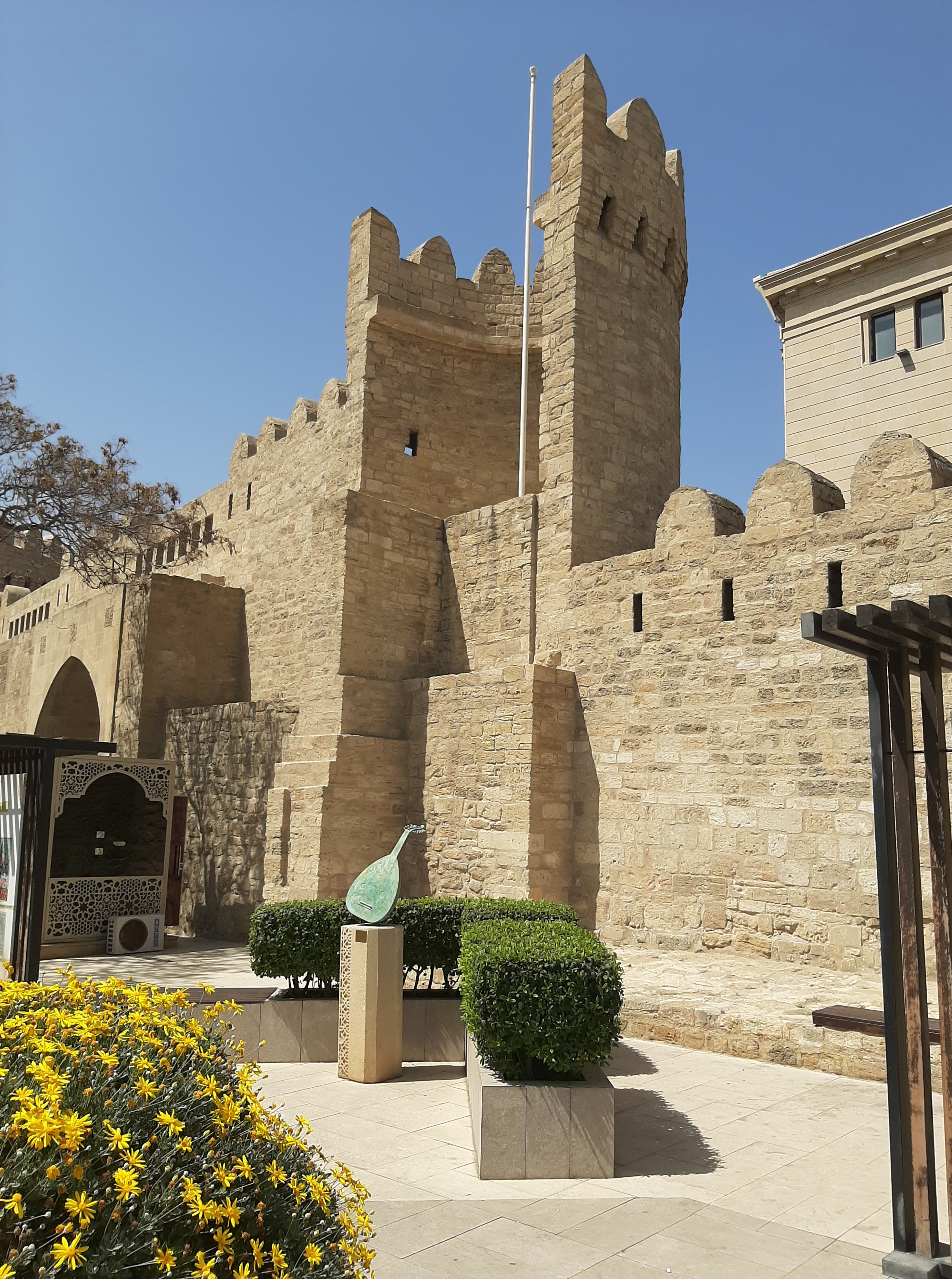 O tepeden şehir manzarasına ve Hazar Denizi’ne son kez bakıp çiçekli merdivenlerden aşağı indim. Kız Kalesinin önünden geçip İçeri Şeher’le vedalaştım. Filarmonya Bağının önündeki piyanolu meydanda düğün fotoğrafı çekilmekte olan bir gelin-damat gördüm. Fotoğrafçı gelinin makyajıyla ilgilenirken damat sıkıldı, olağan bir şekilde piyanonun başına oturup çalmaya başladı, azıcık dinleyip karşıya geçmek üzere alt geçide indim. Alt geçitte biri tar, biri gaval çalan iki müzisyen çocuk vardı, durup video çektim. Dört günün dördünde de buraya ait ezgileri bir şekilde canlı dinleyebildiğimi fark edip sevindim. Edebiyat Müzesinin önündeki Dede Korkut heykeline göz kırparak yola devam ettim ve yeni hikayelerimin neşesini ıslağıma üfledim: