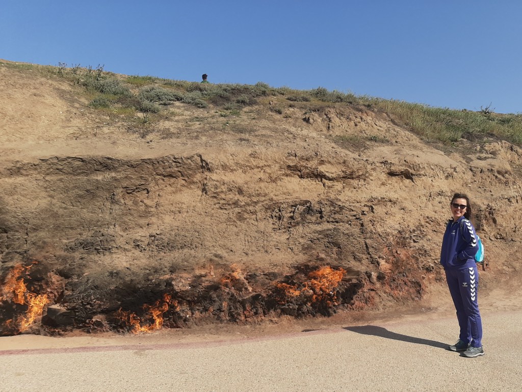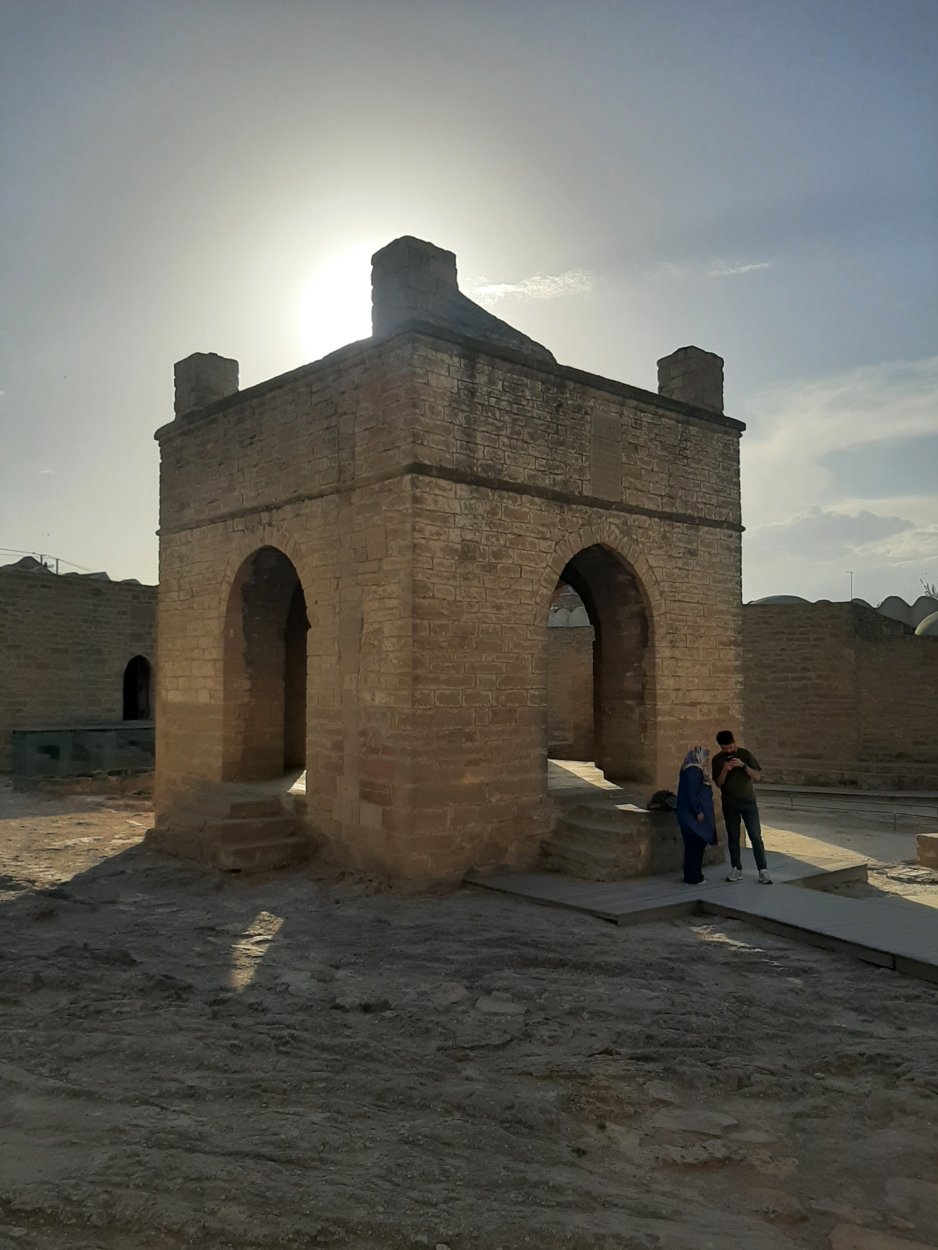 Turun devamında Yanar Dağ dedikleri bir bölgeye uğradık. Hazar Denizinin Abşeron Yarımadası, altındaki doğalgaz ateşinden ötürü ‘ateş toprakları’ olarak biliniyormuş. Yaklaşık üç metrelik bir alanda, tüm doğa olaylarına rağmen binlerce yıldır sönmeyen, kimyasal açıdan oldukça zehirli bir ateş yanıyormuş. Hızlıca etrafında dolaşıp Zerdüşt Tapınağına gittik. Yol boyunca, bakraçla kuyudan su çekiliyor gibi görünen petrol sondaj kuyuları vardı.