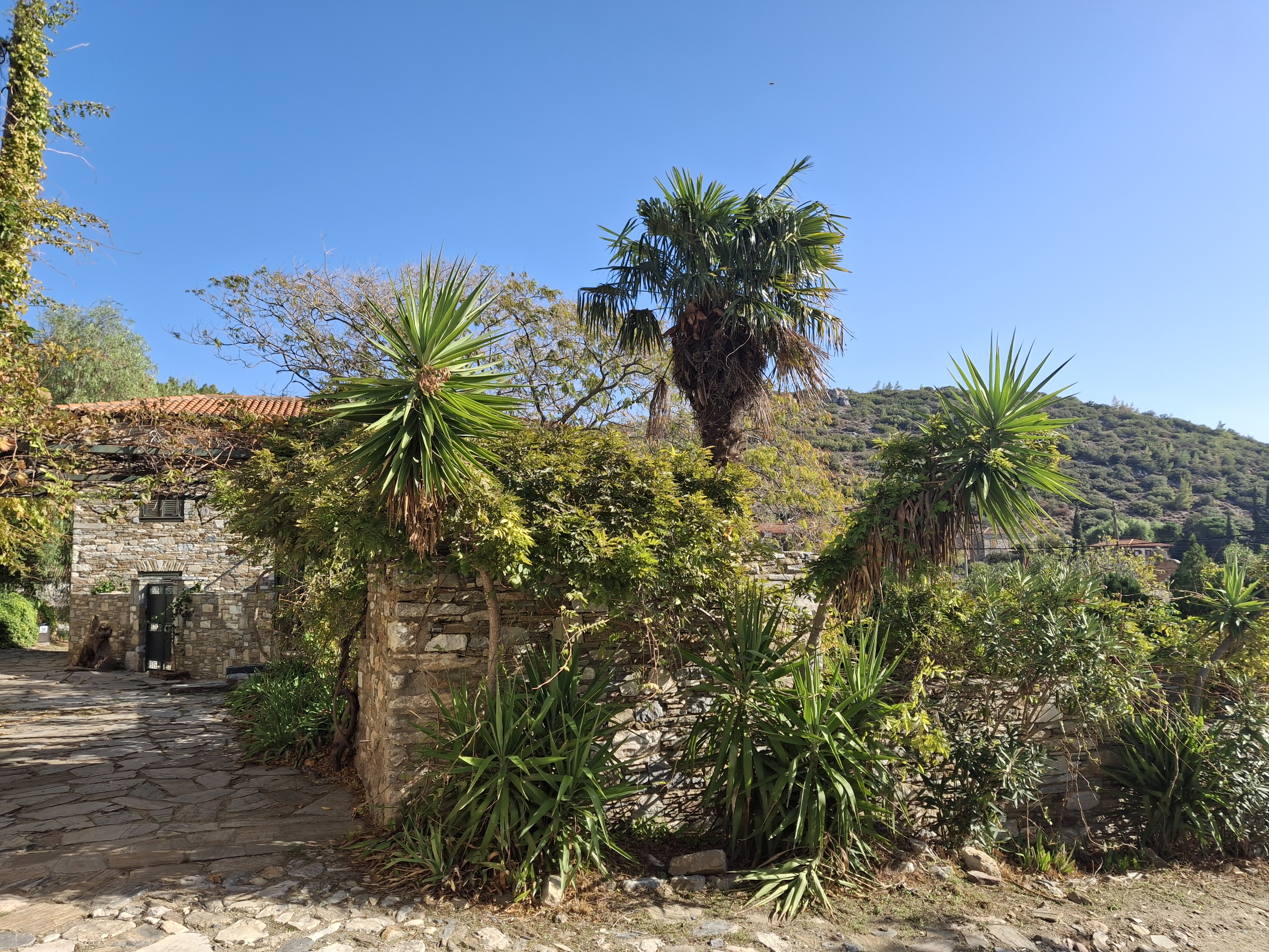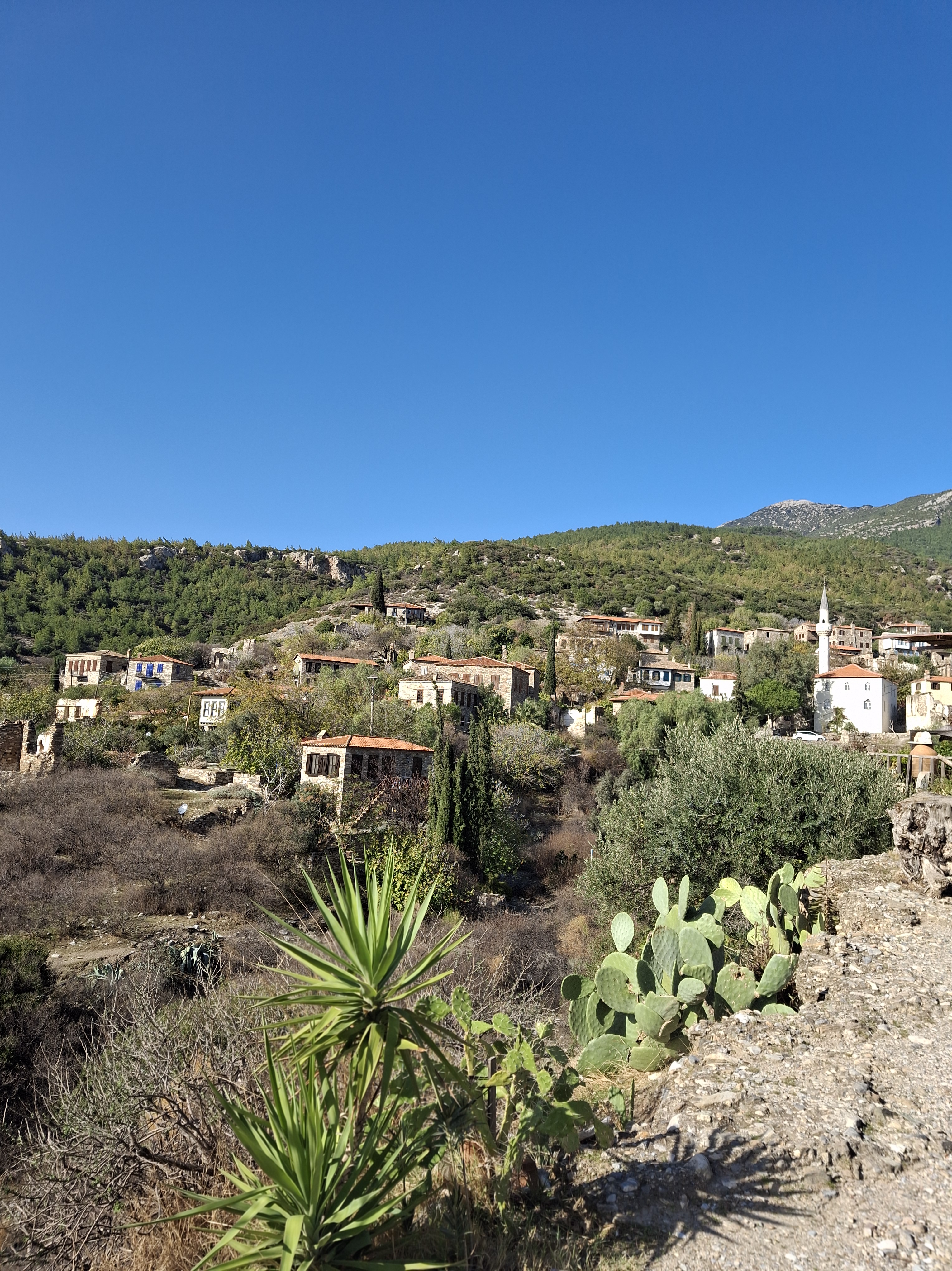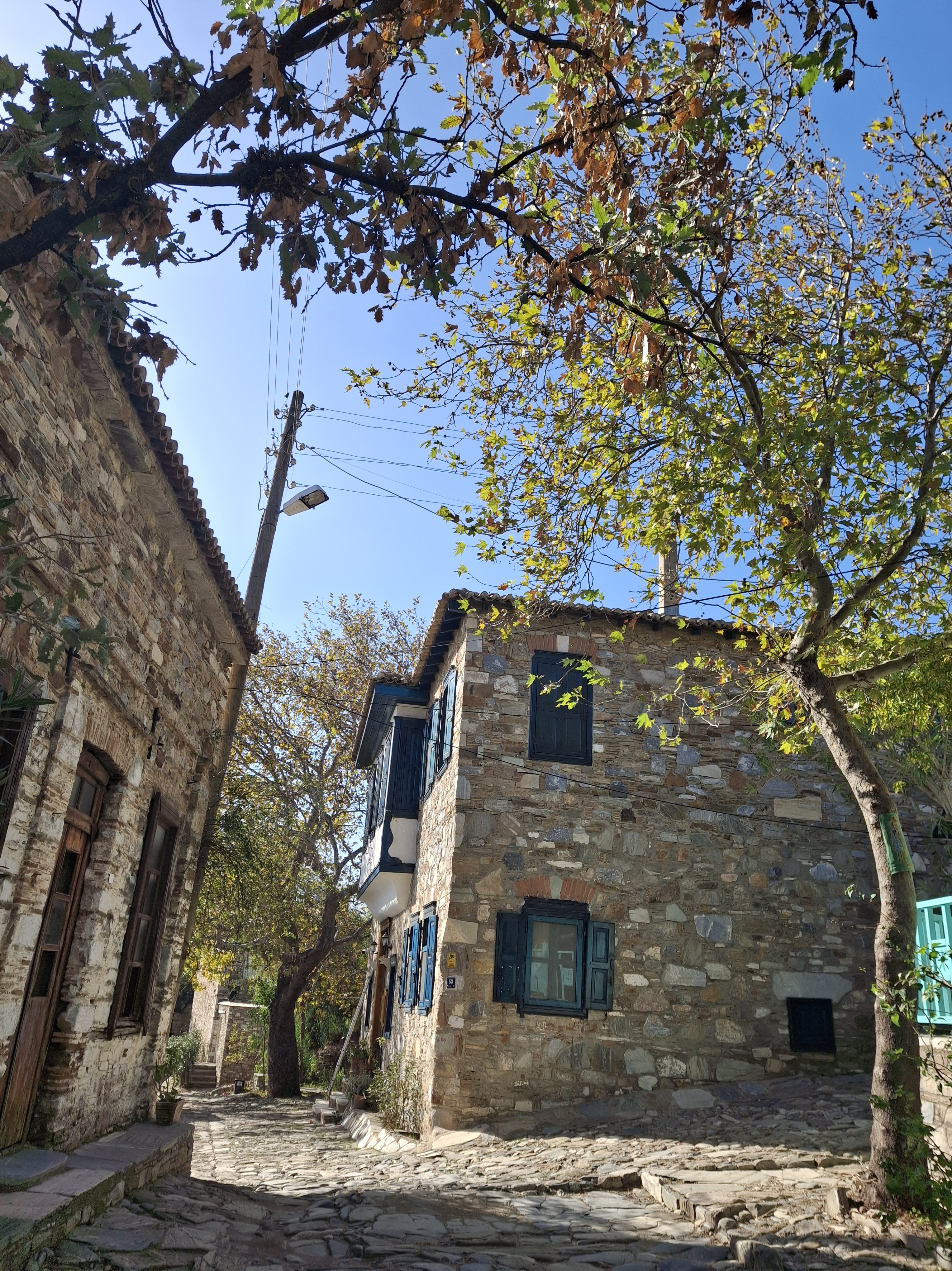 Doğanbey, Aydın’ın Söke ilçesine bağlı, Büyük Menderes Nehrinin Ege Denizine dökülürken delta ovası yarattığı Dilek Yarımadasına bakan bir tepede. Son zamanlarda sosyal medyada çok karşıma çıkan, taş evlerle dolu, eski bir Rum Köyü. Rumca ‘odalar’ anlamına gelen ‘Domatia’ imiş eski adı. 1924 Mübadelesiyle köyün sahibi Rumlar Yunanistan’a göçmüş, Yunanistan’dan gelen Türkler de buraya yerleştirilmiş ancak Türkler bir süre sonra iki km aşağıdaki Yeni Doğanbey Köyünü kurarak oraya taşınmışlar ve buradaki evler bir süre ıssız kalmış. Tıpkı Fethiye’deki Kayaköy gibi. Son yirmi yıldır bu taş evler peyderpey aslına uygun restore edilerek otele, kafeye ve restorana çevrilir olmuş. Bu bilgileri, köyden ayrılırken ayaküstü sohbet ettiğimiz bir kafe işletmecisinden öğrendik. Yazın çok kalabalık olan köy şansımıza o gün çok sakindi, rahatça dolaştık. Begonvillerin, turunçların, zakkumların, palmiyelerin taştığı bahçeleri, şirin evleri, teklifsizce kucağımıza oturan sıcakkanlı kedileri bol bol fotoğraf çektim.