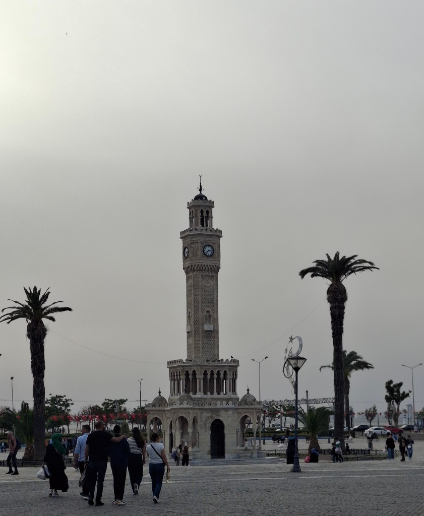 Öğlen vakti İzmir’e indim, havalimanından Konak’a vardım. İzmir merkeze 2005 yazında, Dünya Üniversite Yaz Oyunları zamanında turist olarak gelmiş ve Dokuz Eylül’de okuyan çocukluk arkadaşlarımın rehberliğinde gezmiştim. 2012’de Özlem’in düğüne geldim, sonrasında hep birkaç yılda bir, bir yerlerden dönerken bir geceliğine Özlemleri görmeye uğradım, geçtim. Fakat bu bahar birkaç gün eylenip tadını çıkarmaktı niyetim. Konak metro istasyonu meğer Saat Kulesi’nin dibindeymiş. Saat Kulesi hatırladığımdan daha küçük göründü gözüme. Konak Meydanı binalarla dola doldurula kule eski heybetini biraz yitirmiş.