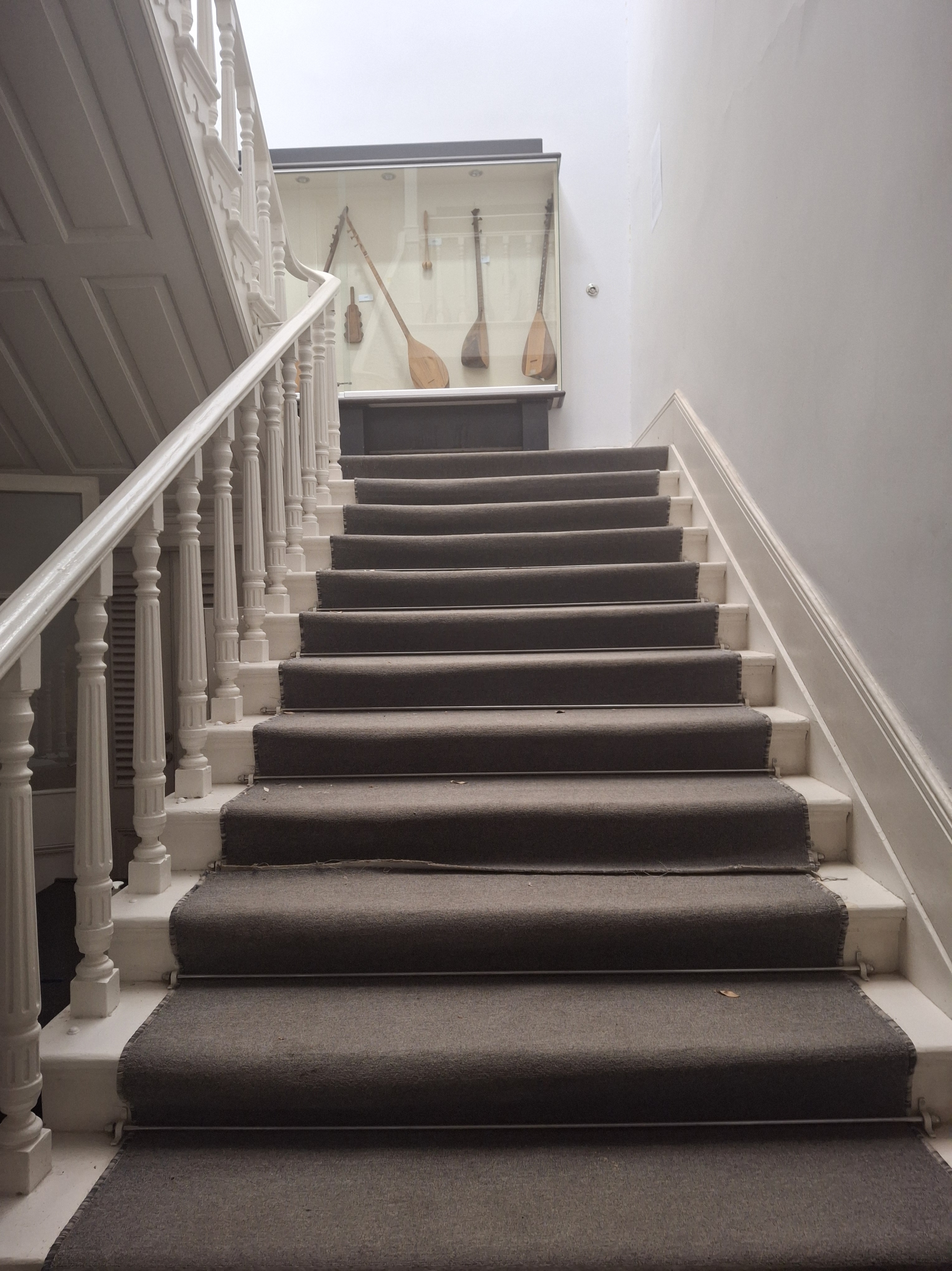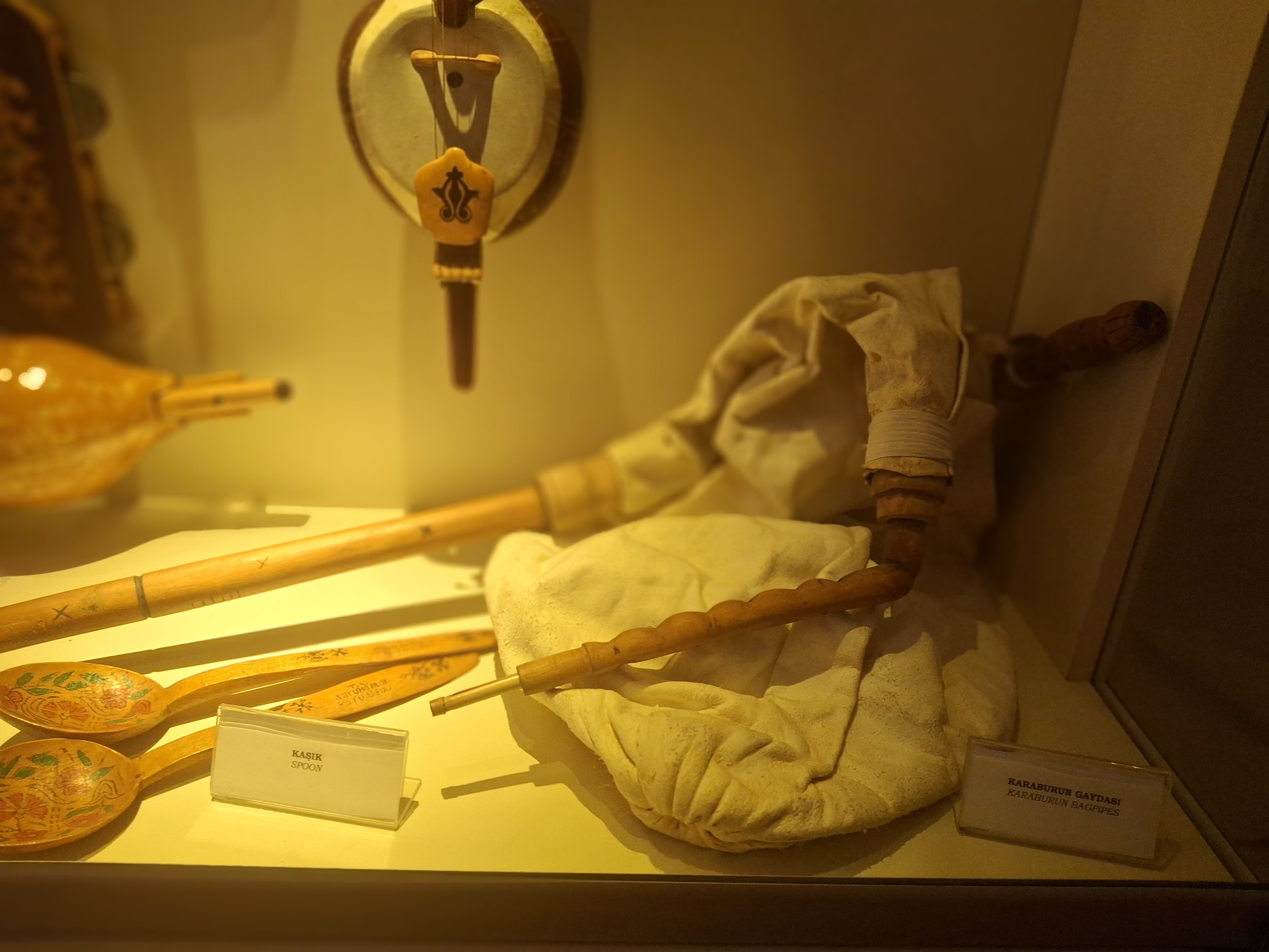 İzmir Kültür Sanat Vakfı tarafından kurulan ve çeşitli enstrümanların sergilendiği Müziksev Müzesi normalde hafta sonları kapalıymış. fakat geçen yaz Müzik Köyünde tanıştığım lutiye Ozan Özdemir hocam orada, üst kattaki atölyede çalışmaktaymış. Nazım Hoca sağ olsun, önceki günden kendisini arayıp benim için özel randevu aldı. Ozan Hoca’yla kapıda buluştuk. Mor begonvilli bahçede biraz sohbet ettik. O atölyesine çıktı, ben alt kattan başlayıp tek tek camlı sergilerin ışıklarını açıp, enstrümanlara bakıp, açıklamaları okudum. Burası da ‘bağdadi’ mimaride eski bir konak binasıydı. 2011’de, koleksiyoner Güner Özkan’ın topladığı özgün Türk sazlarından oluşan müzede en çok; Monol Usta tarafından yapılmış, 100 küsur yaşındaki gürgen gövdeli, kayın saplı ‘ahenk cümbüş’ü, perküsyon için kullanılan ‘kaynana zırıltısı’nı ve ‘Karaburun Gaydası’nı sevdim.