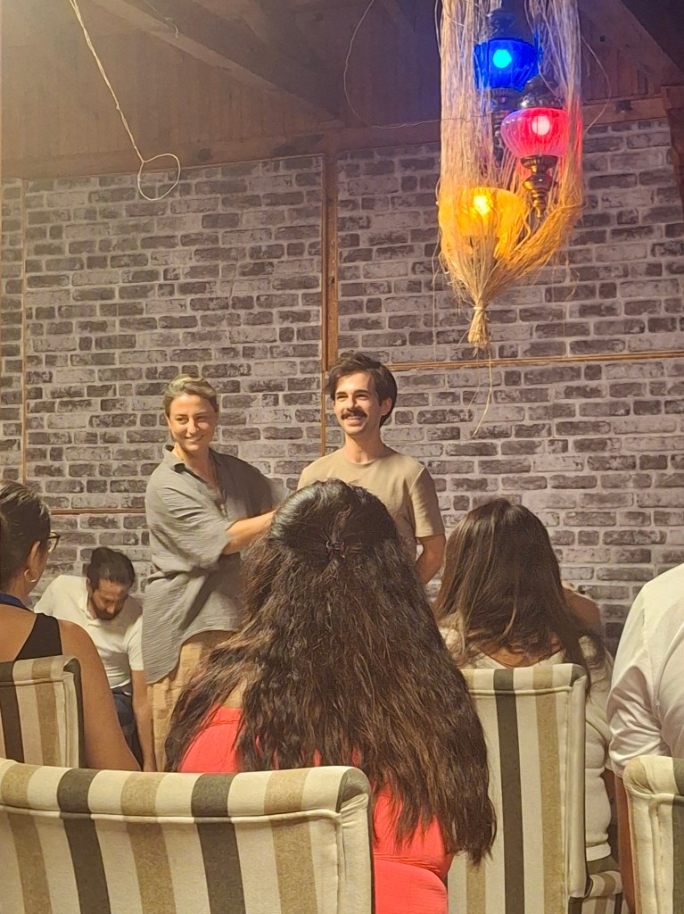 İlk gece meşkinde ‘Konyalım’ı Stelios Kazancakis versiyonuyla çalıp söylememe gözleri parlayan Dimitris’de de gördüm aynı neşeyi. Amerika’dan gelen, 2023-Fethiye Müzik Köyünde tanıştığım Dimitris, Selanikli bir Yunan. Yüz yıl önce atalarımız mübadelede karşılıklı yer değiştirmiş. Onunkiler Keşan’dan Selanik’e giderken, benimkiler Selanik civarından Keşan’a gelmiş. Buzukiyi, udu ve sanırım tüm telli çalgıları çok iyi çalıyor. Teksas’ta müzikoloji doktorası yapıyormuş, tez konusu; dünya üzerindeki müzik köyleri imiş. Bu yıl arkadaşı Filistinli Abdala (Abdullah) ile birlikte gelmiş.