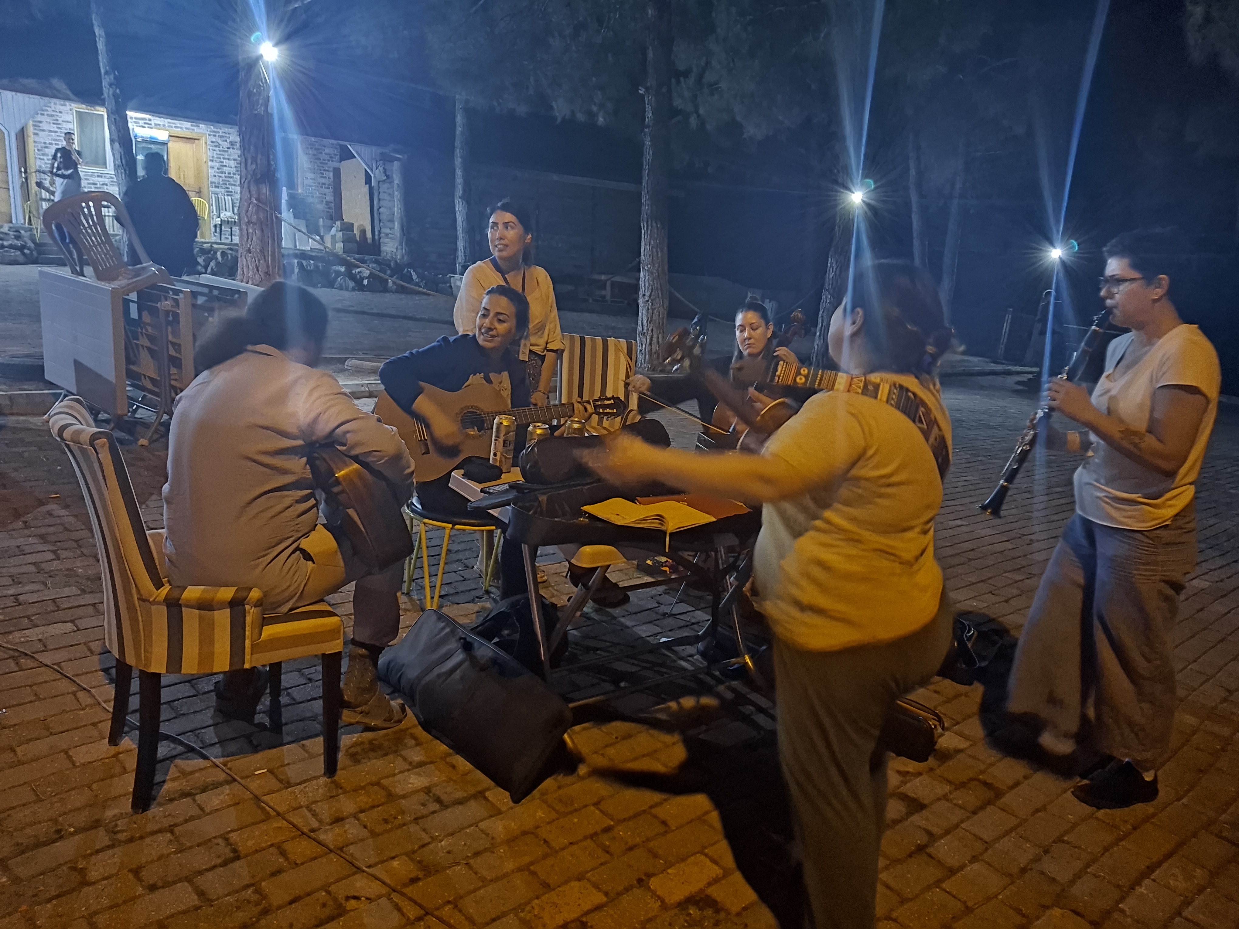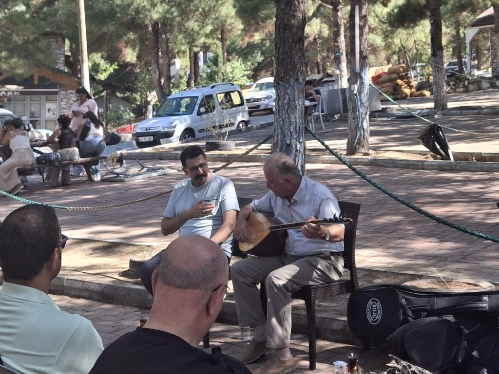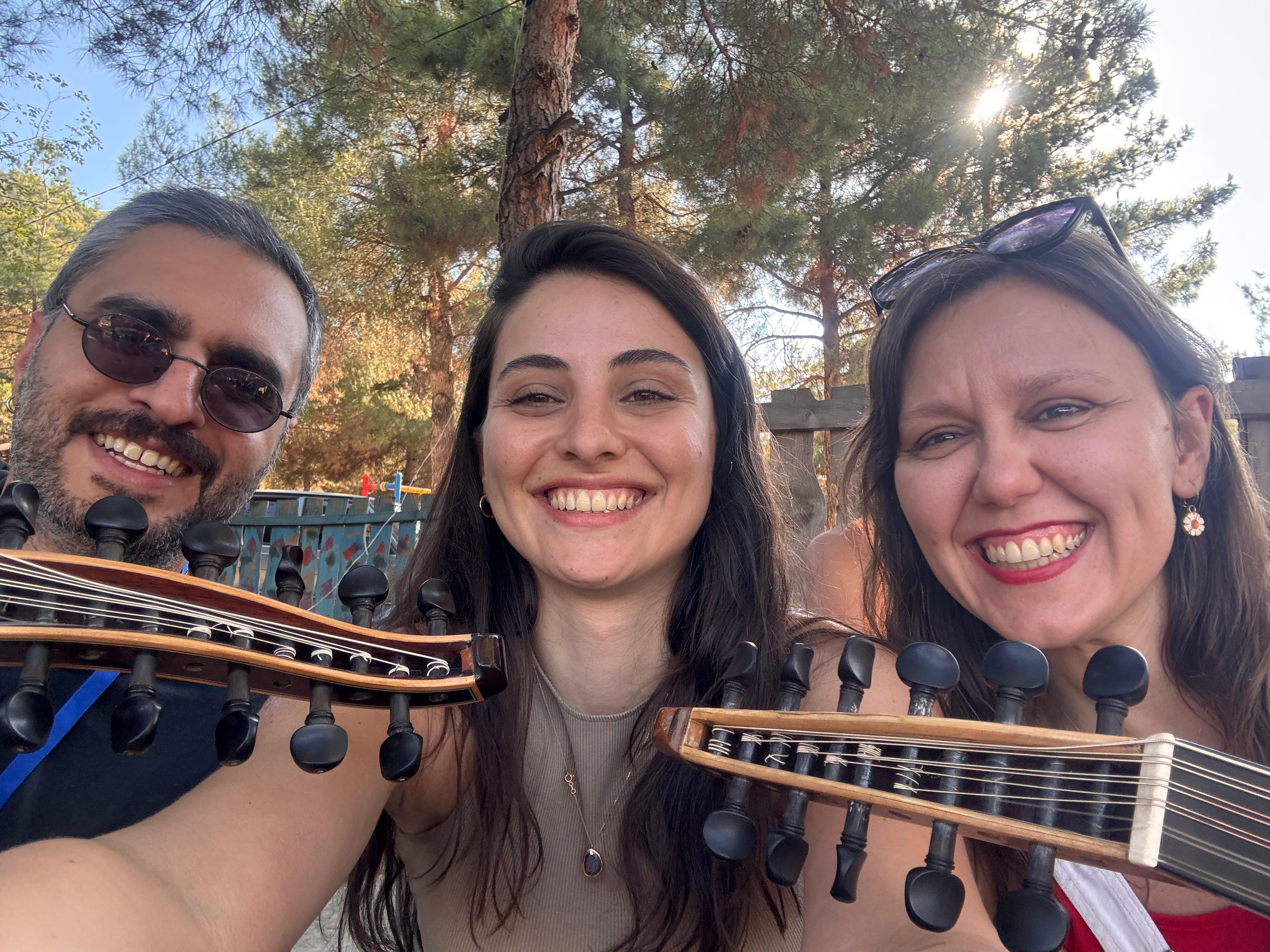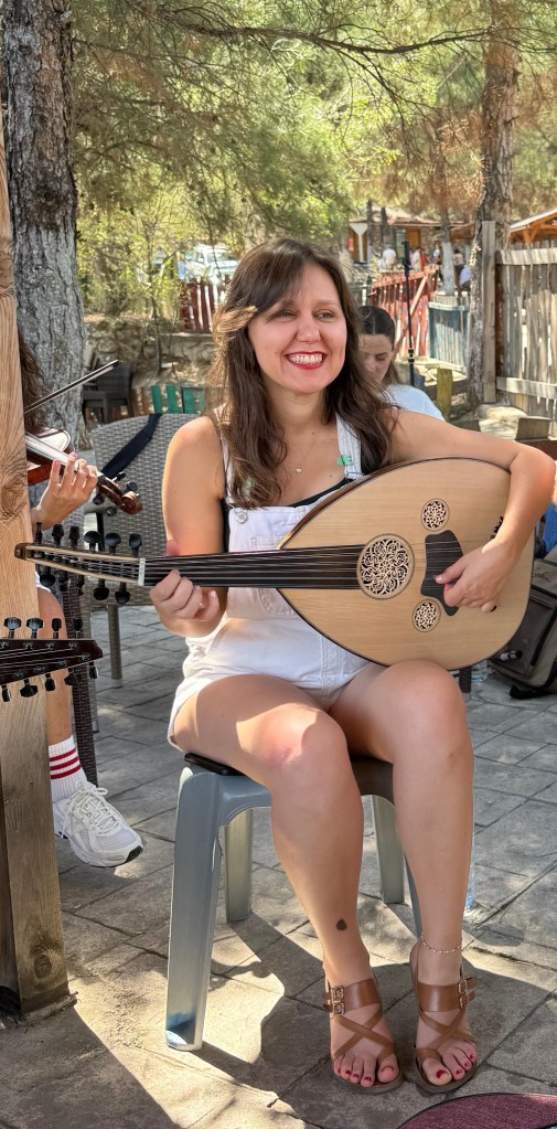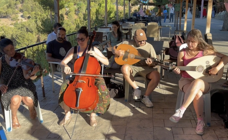 16 Ağustos Cumartesi sabahı Ankara’dan köylüm Utku’yla yola çıkıp öğlen köyün kurulduğu Amasya Vadipark’a vardığımızda Chrisanthi’nin Yunanistan Müziği Atölyesi çoktan başlamıştı. Chrisanthi ile 2022’de katıldığım ilk Müzik Köyünde, Minör Asya Repertuarı Atölyesinde tanıştık. Klasik kemençe ustası, müthiş yetenekli, güler yüzlü ve bir o kadar da mütevazı, gencecik bir kadın sanatçı. 2022’den beri o da Müzik Köylü. Farklı periyotlara katıldığımız için epeydir görüşemiyorduk. Bu yaz onunla ve onun udi arkadaşı, diğer atölye yürütücüsü sanatçılardan biri olan Güney Kıbrıslı Gerasimos Papadopoulos ile birlikte çalmak çok keyifli oldu.