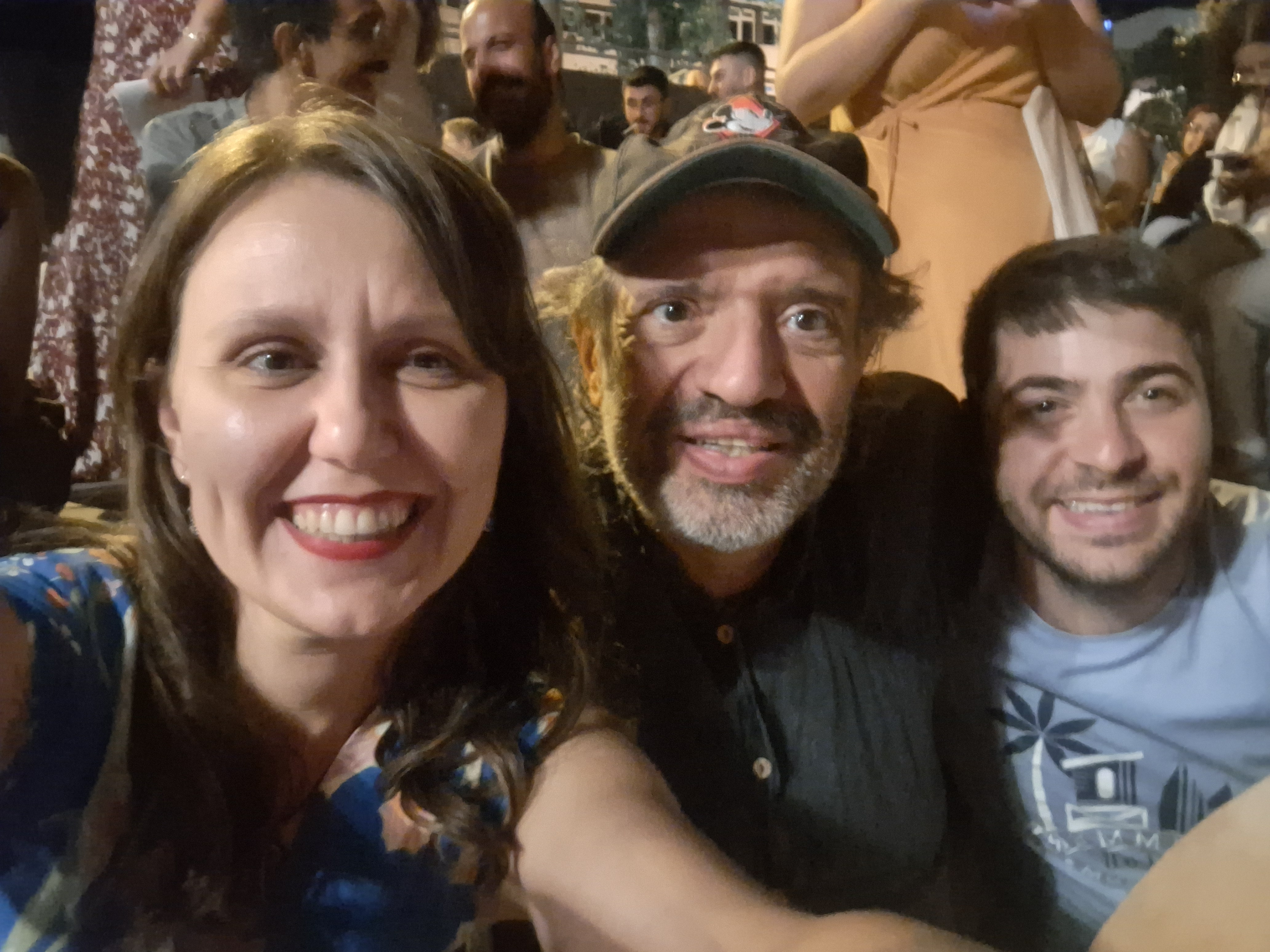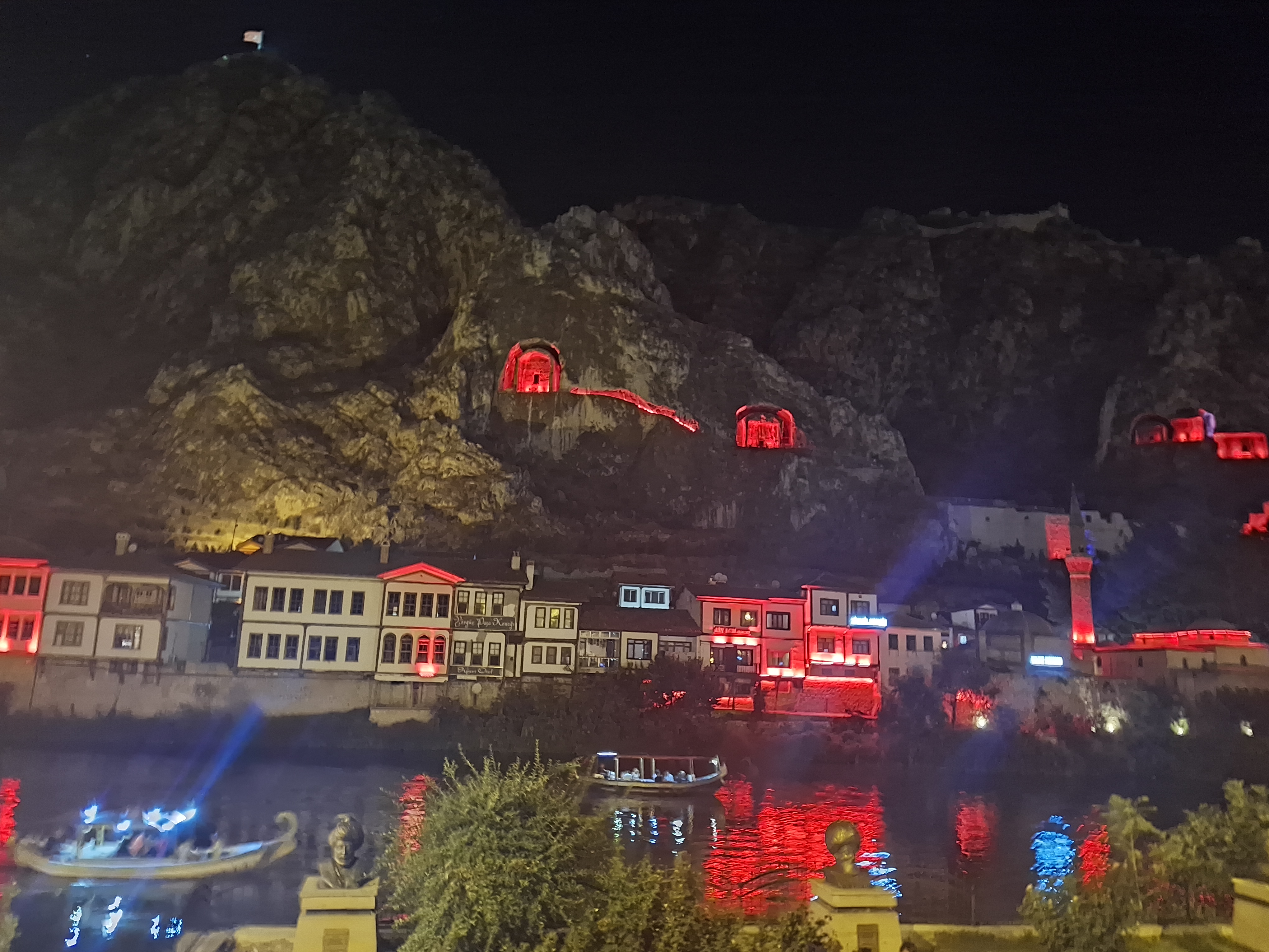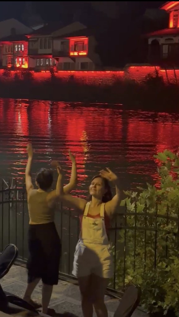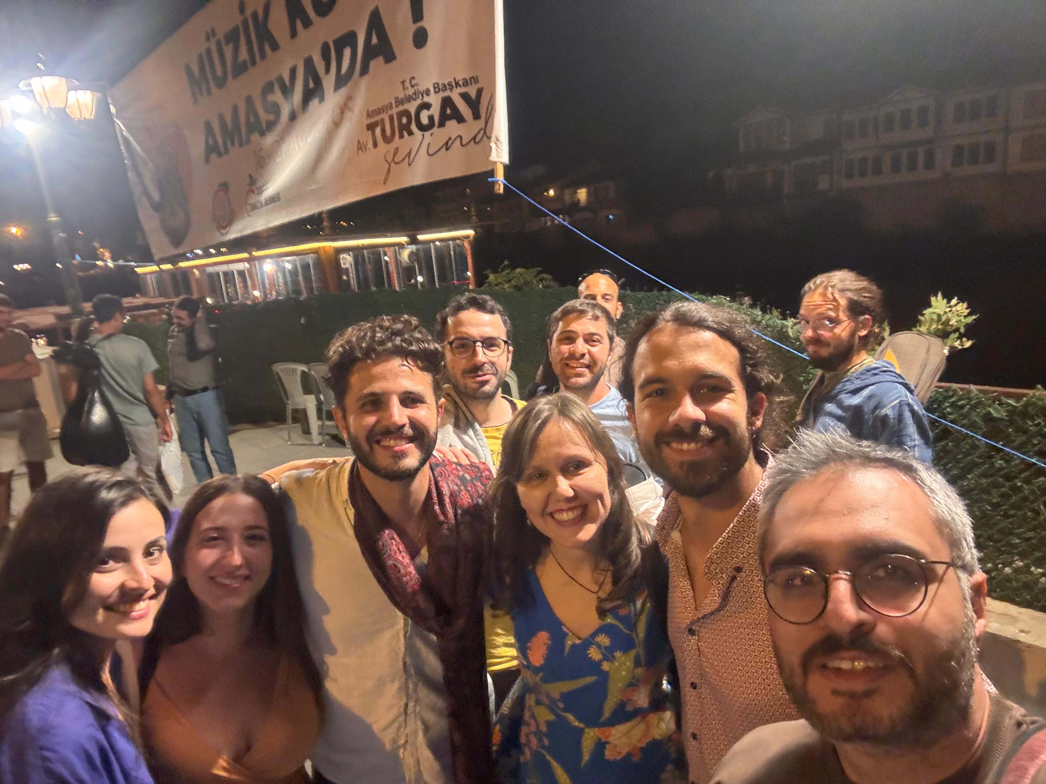 İkinci akşam Amasya’nın Pirler Parkı’nda bizim için verilen yemekten sonra, şehrin arnavut kaldırımlı ara sokaklarından çala-söyleye-oynaya meydana inen, çok eğlenceli bir kortej yaptık. Fareli Köyün Kavalcıları gibi. Sonra meydanda, üç dakikada kurduğumuz müzik grubumuzla, önceki yılların ve ilk iki günün repertuarından oluşan mini bir konser verdik. Kendimiz çaldık, kendimiz söyledik, kendimiz oynadık. Seray’la ikimiz Yeşilırmak kıyısında göbek atarken Dilek Türkan videomuzu çekmiş. 🙂