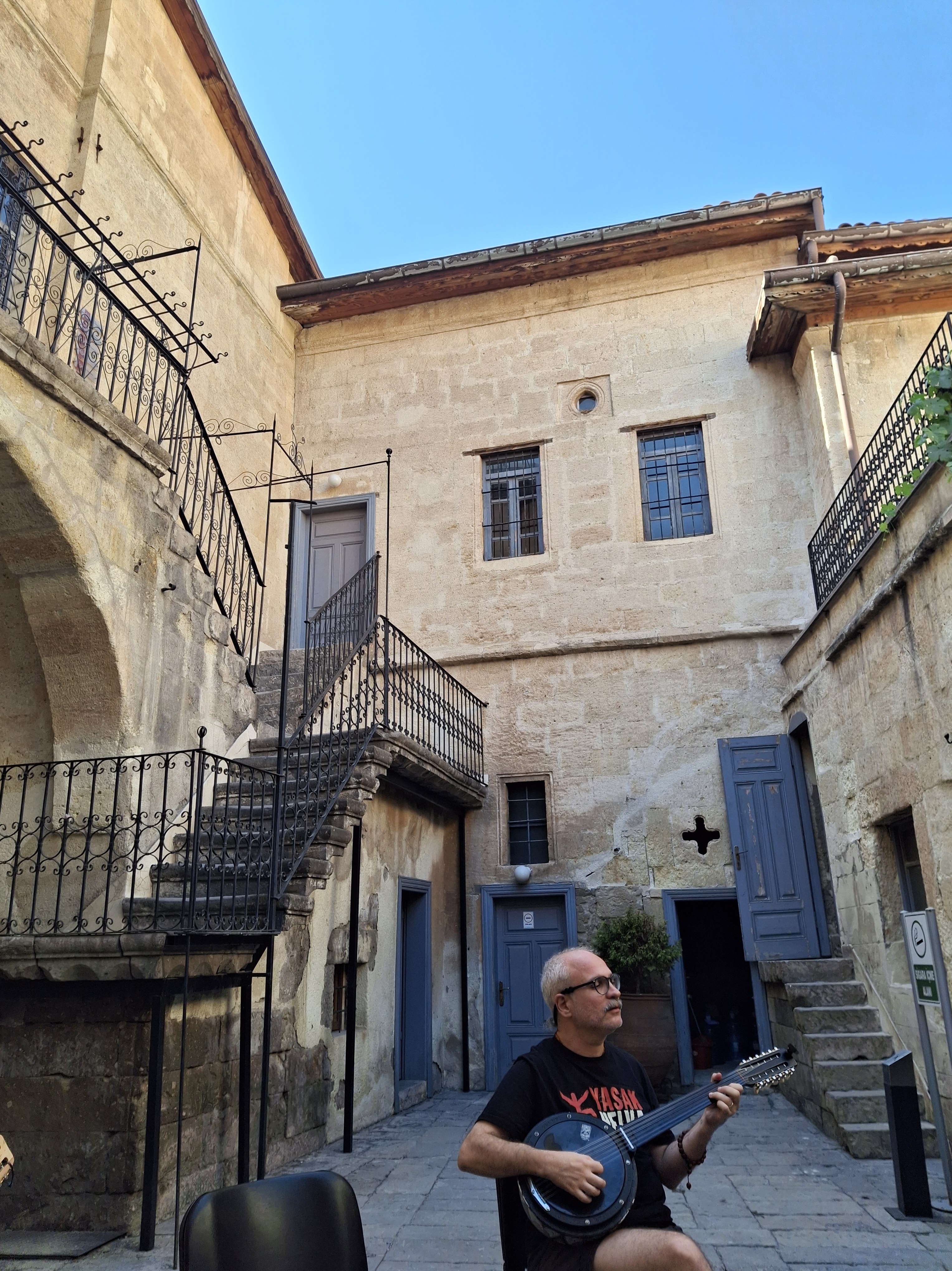 Mustafapaşa’da günler daha erken başlıyordu ve günde üç atölye vardı. Her gün Korkut Hocayla cümbüş çalıp Haris’in rembetiko atölyesinde Yunanca repertuarımı genişletmek dışında, arada birkaç kez de Salih Nazım Hocamın iki telli atölyesine katılabildim. Her iki Salih Hocanın (Duble Salih’in), müziğe ve hayata bakışları, arayışları, tarifleri bana çok yakın ve iyi geliyor. Yaptıkları müzik de, keyifli sohbetleri de ufkumu açıyor. O yüzden geçen yıl da, bu yıl da Kapadokya coğrafyasındaki Müzik Köyüne onlar için geldiğim doğrudur.