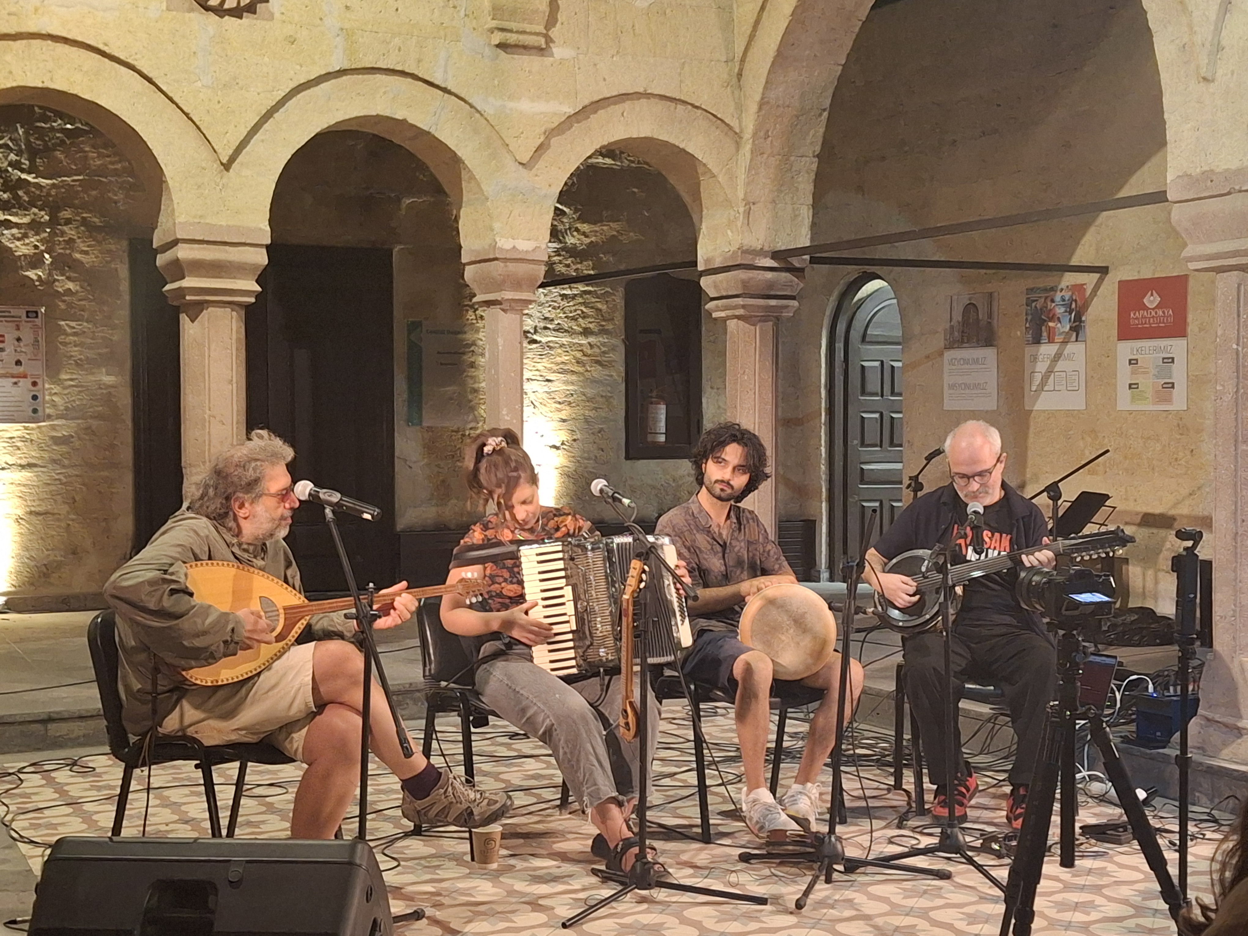 Bu kısa tarihi, Nevşehir’in Ürgüp ilçesinin Mustafapaşa beldesindeki Kapadokya Üniversitesinin içinde, otantik taşlı bir avluda, kökleri Silivri’den Atina’ya göçmüş bir Yunan müzisyenden; Haris Tsalpara’dan dinliyoruz. Yunanca’ya Türkçe’den geçmiş ne çok kelime varmış meğer; ‘’canim, yangin, derviş, mahale…’’ Bu taş avluda ve birkaç gündür içinde dolaştığım şu sarımtırak binalarda yüz yıl önce hangi hikayeler dolaşıyordu kim bilir… Sesler, kelimeler birbirine dolanıyor.