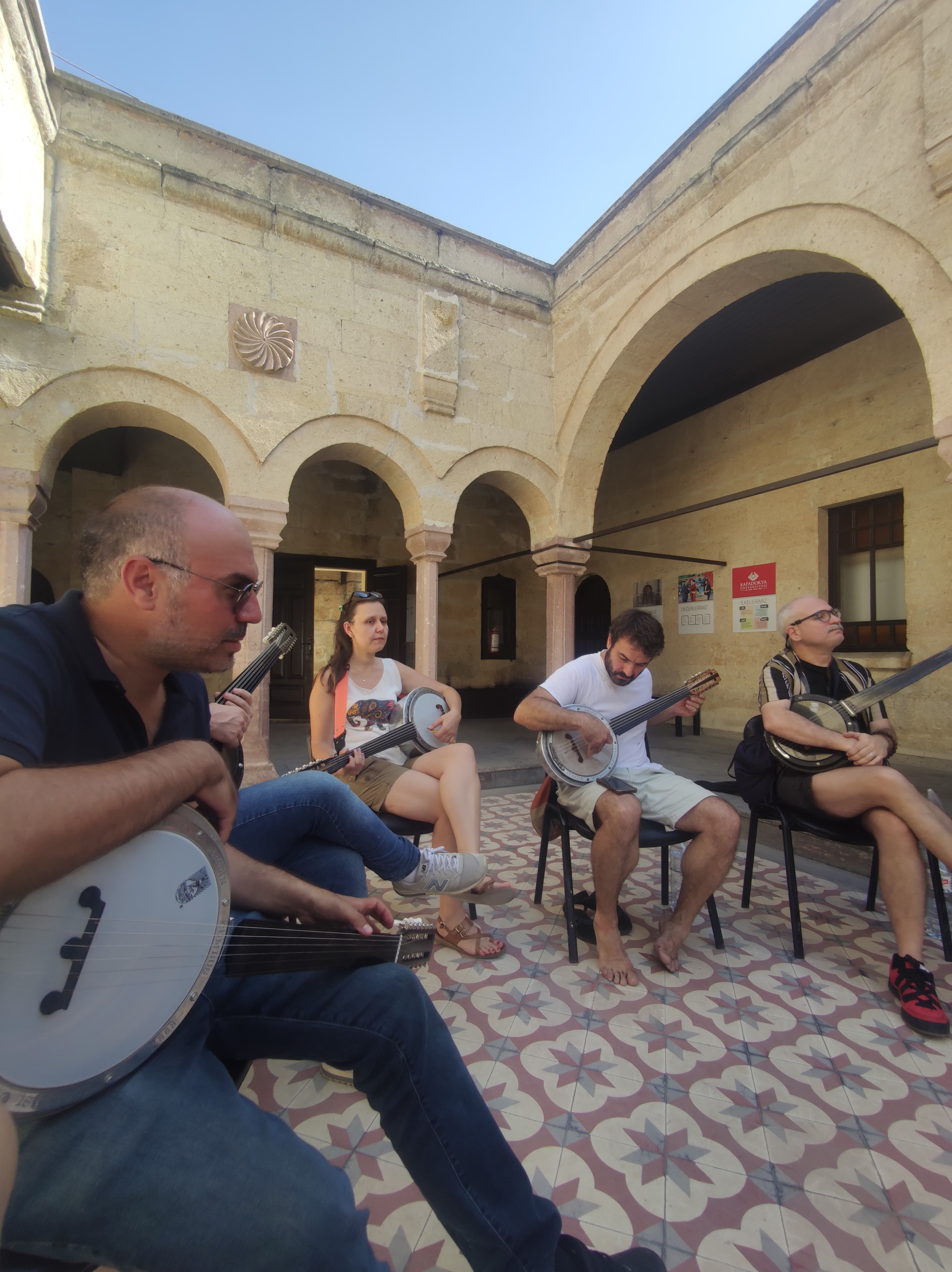 23 Ağustos Perşembe, tanışma toplantısından sonra Kapadokya Üniversitesinden Mert Hoca, atölyelerin yapılacağı mekanları, tarihini de anlatarak hızlıca gezdirdi. Mustafapaşa, yüz kusur yıl önceki adıyla Sinasos, kilisesi, şapeli, medresesi hala yerinde duran bir eski Rum kasabası. Şimdi vakıf üniversitesi olan Kapadokya Üniversitesi, çoğu yapıyı koruyarak ya da aslında uygun restore ederek film seti gibi bir kampüs oluşturmuş, Müzik Köyümüze ev sahipliği yaptığı bu yaz ne mutlu ki, bize de beş gün burada nefes almak kısmet olmuş.